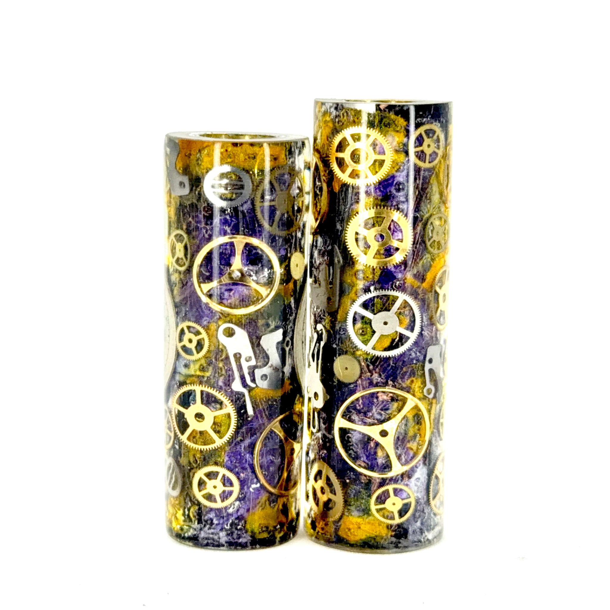 Watch parts pen blank made with a Mardi Gras steampunk motif . This blank fits the standard 10mm cigar pen available at most pen kit distributors.